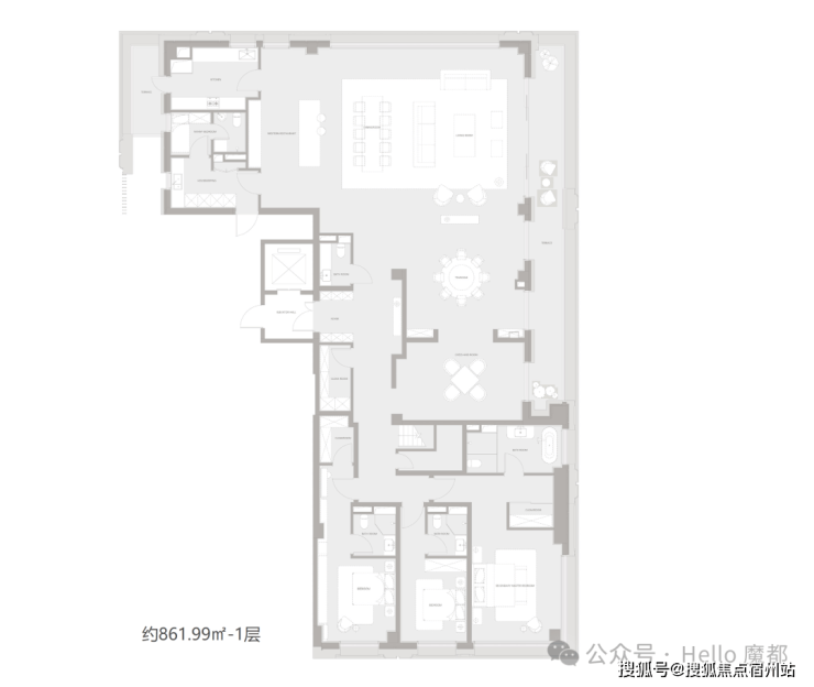 其中, A地块共计150套天际大平层,面积为建面约264-901㎡,主力户型为4房-5房。