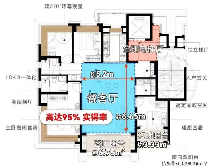 约6-6.6㎡全明梯厅,类一梯一户设计,同面积段罕见,在保利外滩曜,所有业主享有完全平权的入户仪式感与私密性。全屋约93%超高实得率,经典“飞机户”布局,0过道浪费。把原本浪费的走廊面积完全融入客餐厨阳空间,实现近乎满分的面积有效利用。