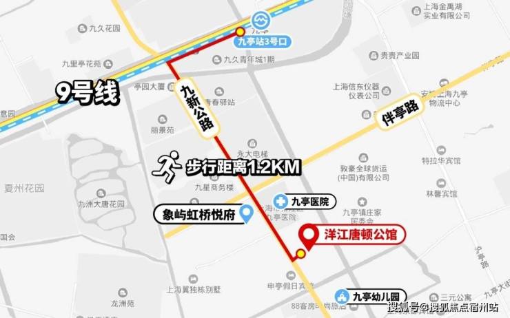 交通方面:洋江·唐顿公馆直线距离九亭站约800米,实测步行约1.2公里,是当下离地铁站较近的新盘。