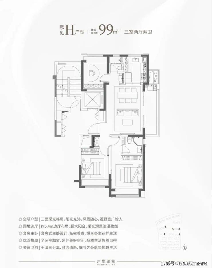 3、楼王H户型:270°环幕江景,绝佳视野和尺度