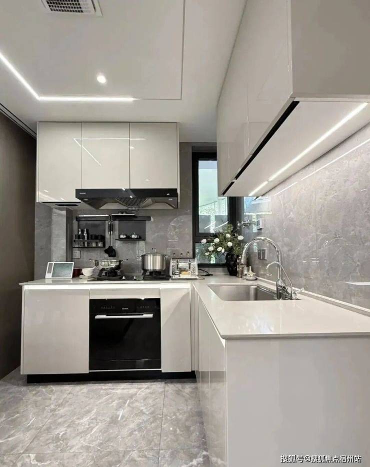 橱柜收纳系统:特别预置洗碗机点位、柜内下拉篮式设计、不锈钢挡油板、柜下操作灯、烹饪全流程功能动线一体化设计;