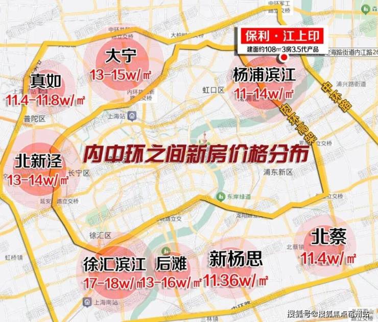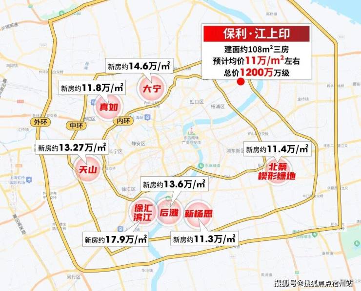 跳出杨浦滨江,保利·江上印建面约108m²三房预计11万/m²左右的均价,在整个上海内中环堪称 “价格洼地”: