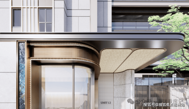 招商臻境地上入户大堂,源自国际奢华酒店大堂灵感,外部采用全画幅落地玻璃,同时也加入了金属弧线装饰设计,在通透感上又增加经典与时尚的设计感。顶部仿古铜纹铝板吊顶,营造出精致的海派装饰氛围。
