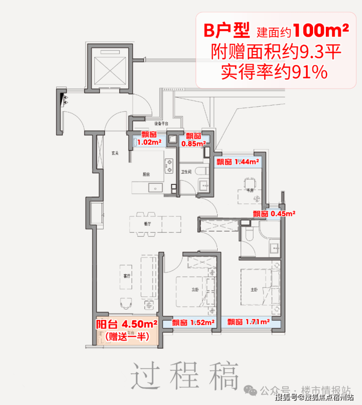常规百平米户型仅3-4个飘窗,总赠送约6-7平;