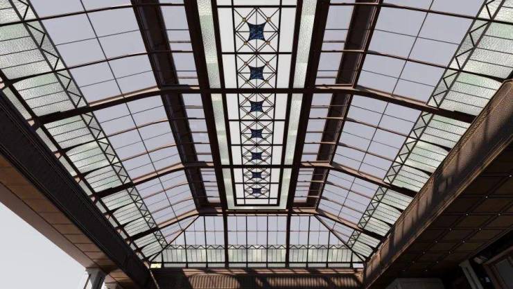 继续向里走,廊道内可见经典的石材立柱、拱形的吊顶、PRADA荣宅的手绘彩玻、繁花的地面拼花等用材工艺,移步异景间,是别样的摩登魅力。