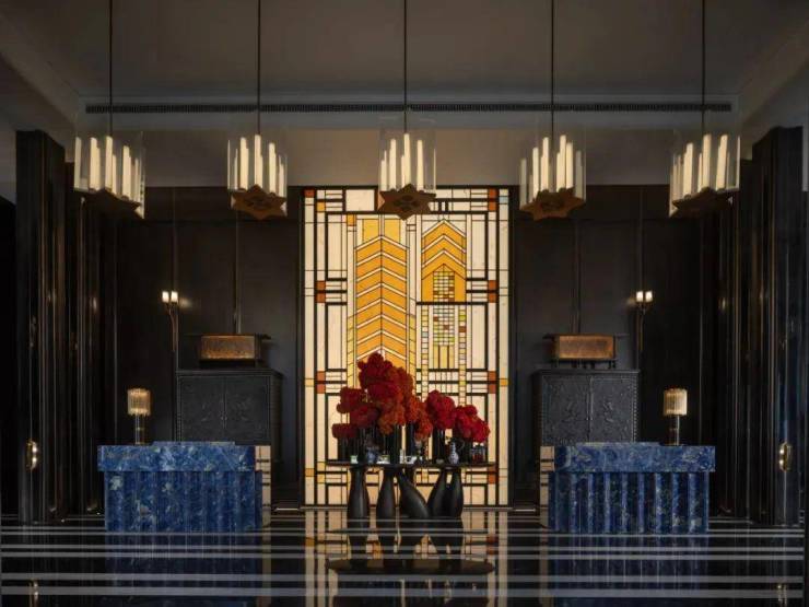进入正门后是奢华酒店式落客区。抬头看,颇具标志性的彩色玻璃穹顶,仿佛穿越回了老上海,这显然是对外滩和平饭店代表性的玻璃穹顶的致敬。