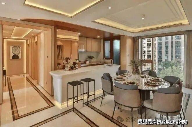 ☑️☑️中环名品公馆售楼处电话:400-8377-020☑️☑️)厨房做了U字型敞开式厨房,与餐厅无缝对接,提高室内空间及烹饪用餐的家庭氛围.
