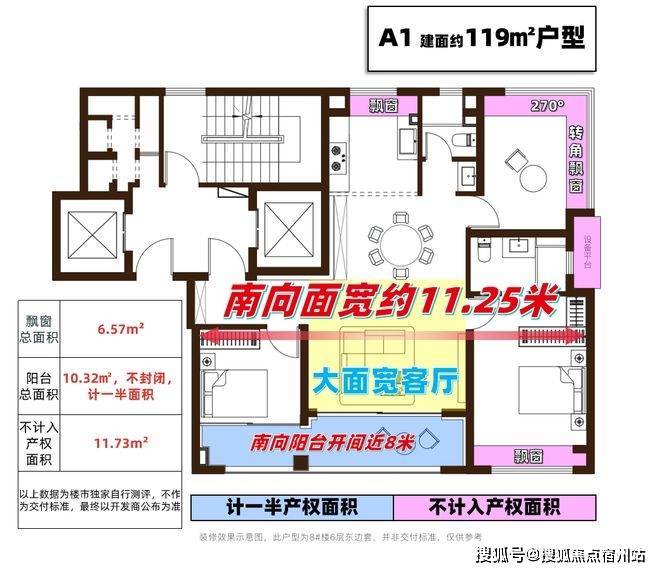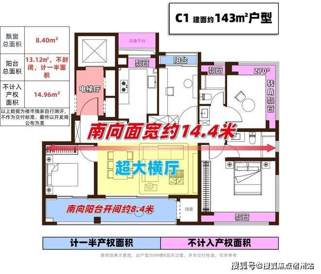 给大家实测一波,建面约120㎡的套内空间实际可利用率,达到了87.7%(含飘窗、阳台,以上数据为楼市独家自行测评,不作为交付标准,最终以开发商公布为准),足以媲美市面上建面约140㎡的户型,不计入产权的面积超过11㎡,就按9万/㎡预期算,买这套房足足可以省下近百万!