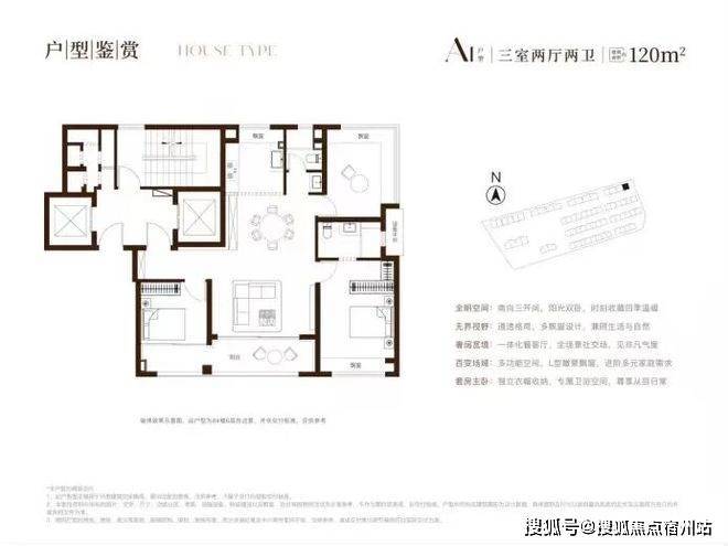 建面约120㎡三房,类一梯一户,户型方正,三开间朝南+南北通透、双联瞰景阳台+主卧飘窗+北卧L型转角飘窗的设计,完全击中了年轻人的“心头好”。