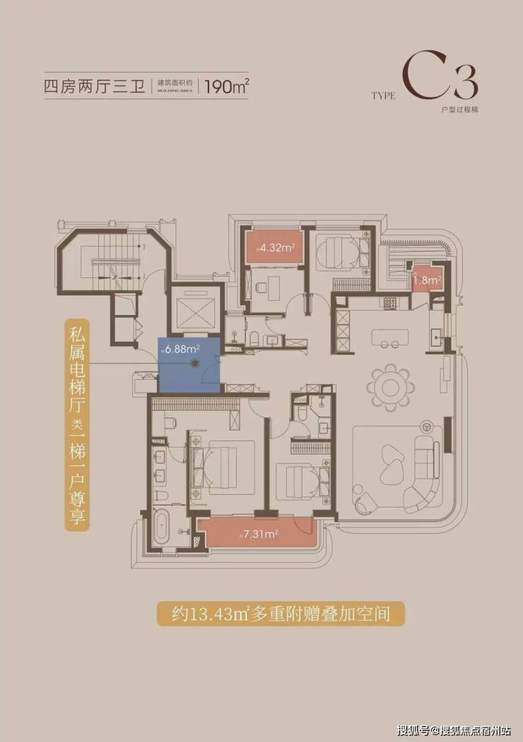建面约190㎡的4房3卫户型,南向双套房的设计,保障了居住的私密性。