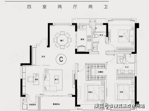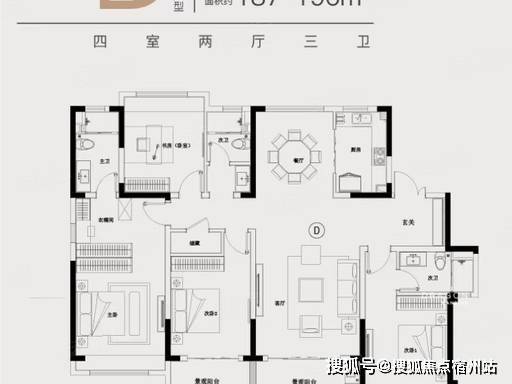 项目明星主力户型,四开间朝南,面宽进深比达 1:1.2,超大采光面让室内全天明亮。客餐厅一体化设计,连接南向宽景阳台,空间开阔通透,可容纳多人社交聚餐;主卧奢阔套房,配置独立卫生间、衣帽间与飘窗,尺度堪比市区大平层;三个卧室 + 客厅朝南,满足三代同堂的居住需求,兼具舒适度与实用性。