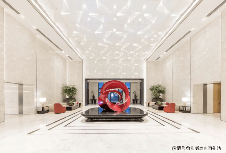 再来看看人行入户大堂,挑高的精装大堂搭配宝华标志性的太阳花装饰,连天花板都嵌入了星空灯光,整个大堂仿若拥有了星级酒店的落客体验。