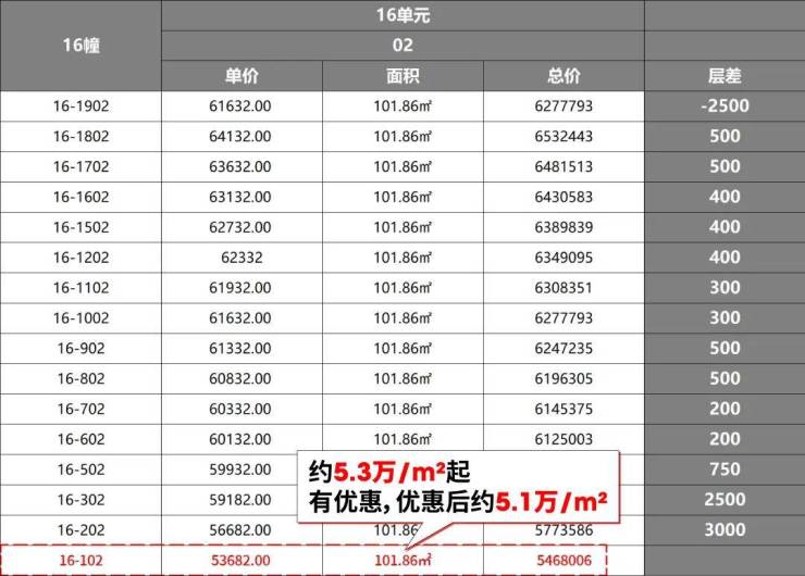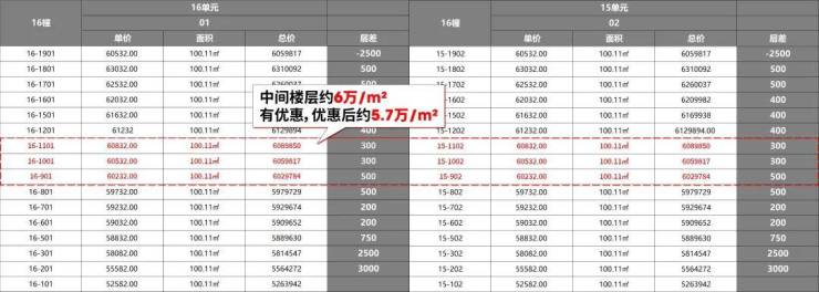 所推楼栋中间楼层(百平米)优惠下来单价仅约 5.7万/㎡,比周边竞品同楼层便宜3000-13000元/㎡。