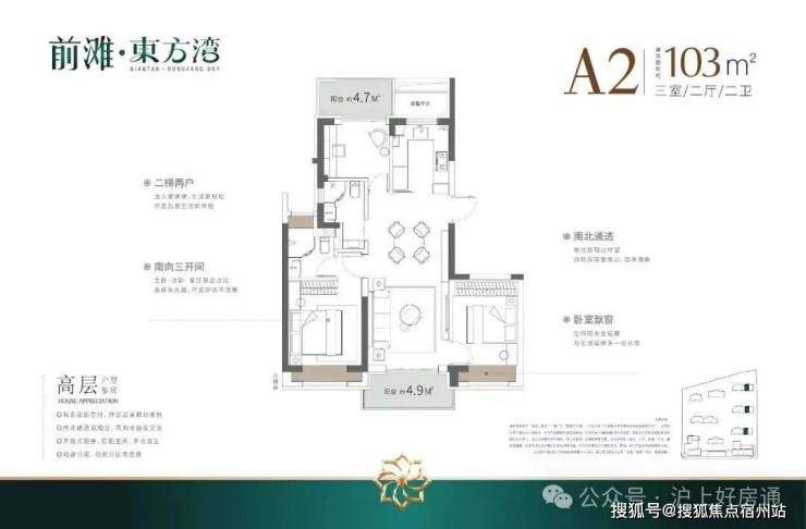 建面103㎡3房2厅2卫, ,户型 三开间朝南 、室内 “5个飘窗+2阳台” ,不管是采光、视野、通风、私密性,还是实用性都十分出色。