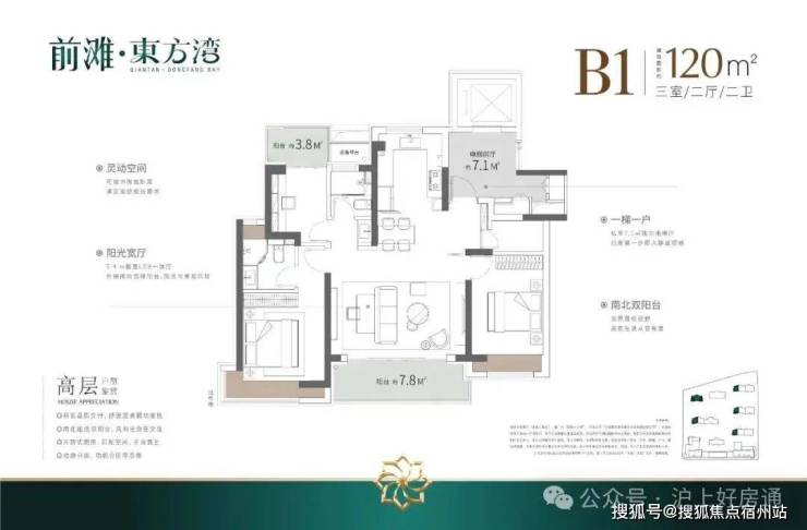 建面约120㎡3房2厅2卫, 做到了 3开间朝南+双阳台+主卧套房设计+270°转角飘窗, 居住体验、舒适度、尺度感倍增。