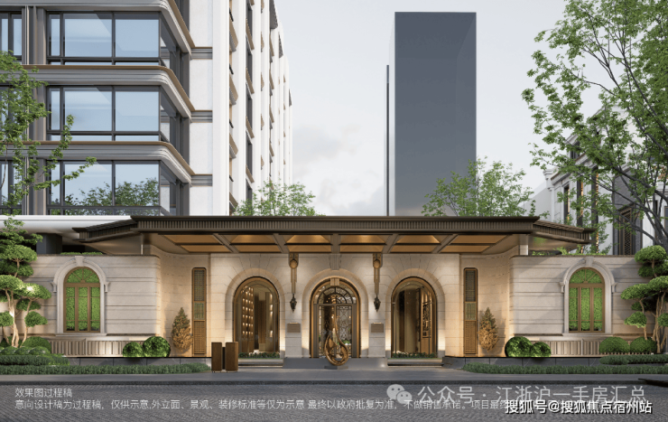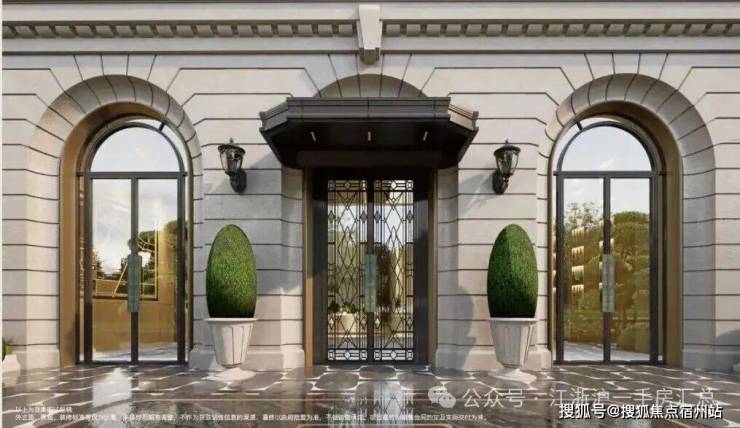 首先,项目西侧人行主入口大门,采用 经典的拱券序列符号,以浅色石材、咖色金属与玻璃的精致搭配,营造出复古奢华的归家仪式! 保利·外滩曜售楼中心电话:400-833-6309(温馨提示:本项目参观样板间采取预约制,为了不耽误您的行程,过来参观请提前来电进行预约看房或咨询项目详情)