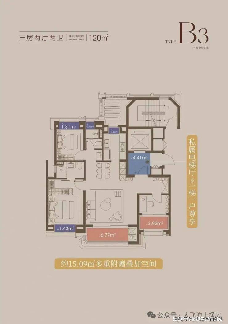 建面约120㎡的大横厅、双阳台产品 ,并没有勉强去做4房,而是打造了一个超宽绰的3房产品。