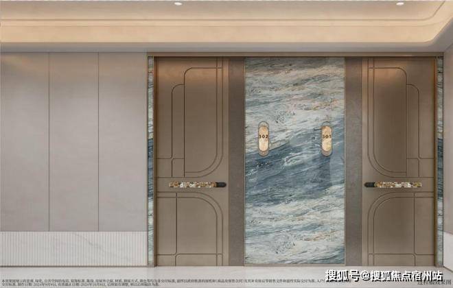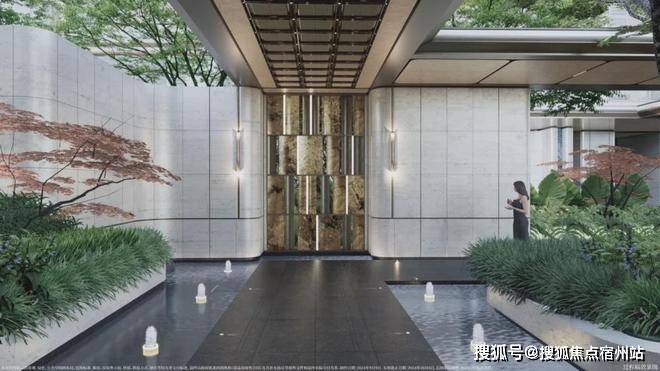 售楼处精心打造“三进式归家动线”,让每一位到访者都能感受到归家般的放松与尊崇。第一进为巷弄式入口,青石板路蜿蜒向前,两侧复古路灯与栀子花、月季盆栽相映,瞬间拉满老上海的烟火气息;第二进是约30㎡的庭院过渡区,中央圆形涌泉水流缓缓溢出,搭配简约石质坐凳,供来访者平复外界喧嚣;第三进为入户大堂,玻璃与金属组合的大门通透轻盈,定制祥云纹铜质把手触感温润,推门时轻微的“咔嗒”声,将仪式感拉满。
