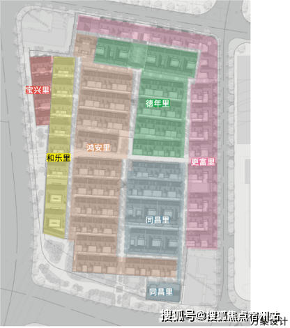 弘安里这块地原由8个街坊组成,其中东寿坊和永安里因后期加建改建较大,体量也很小,为了园区整体考虑,不再保留,延续了剩余6个组团:德年里、和乐里、宝兴里、更富里和鸿安里。