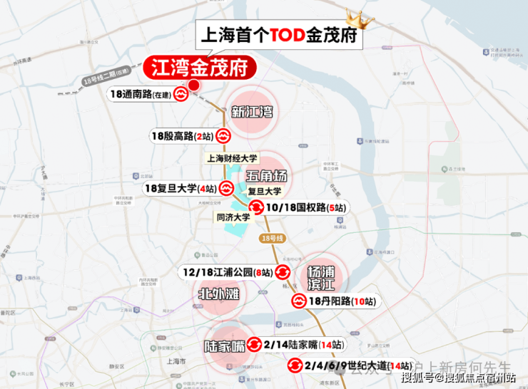 从通南路站(在建)出发,1站就是新江湾,3站财大,4站复旦,5站五角场,7站新华医院,10站杨浦滨江,11站陆家嘴滨江...