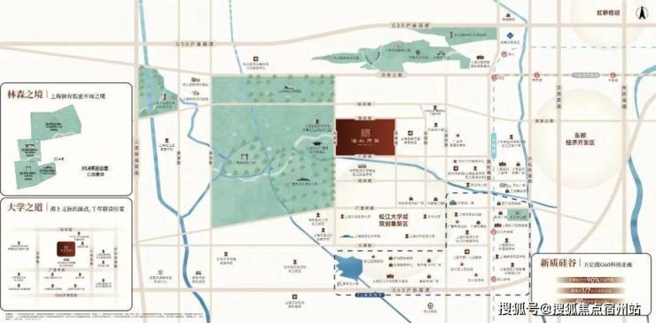项目西侧一路之隔就是广富林文化遗址、广富林郊野公园、直线距离约1km+是辰山植物园,北面直线距离约3km是佘山国家森林公园、月湖雕塑公园等。