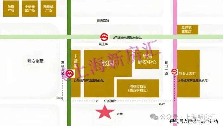 紧邻地标:正北面紧邻百年张园,东北方向为阿丽拉酒店(原四季酒店)及190米高的华润静安中心(在建)、兴业太古汇。