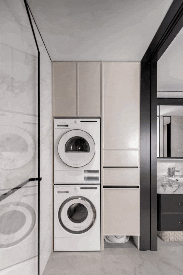 公卫还有全尺寸衣帽收纳空间以及配备洗烘套装的家政间,共同构成了一个高效、便捷的收纳体系。