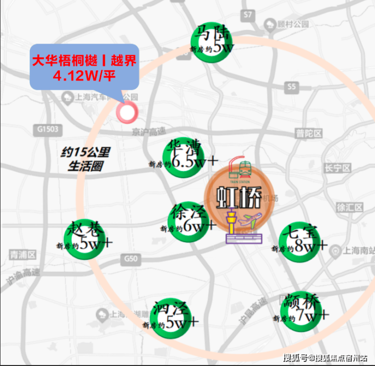 以虹桥为圆心,画一个半径约15公里的圈之后会发现。同样相距虹桥约15公里左右的马陆新盘价格基本上已经接近5w,泗泾、赵巷这些热门板块早已超过了5w,而颛桥更是达到了7w以上......「大华·梧桐樾丨越界」仅约4.12w的联动价显然更具优势。