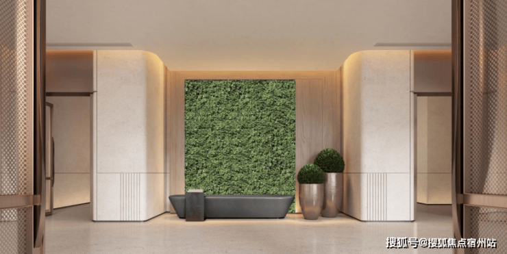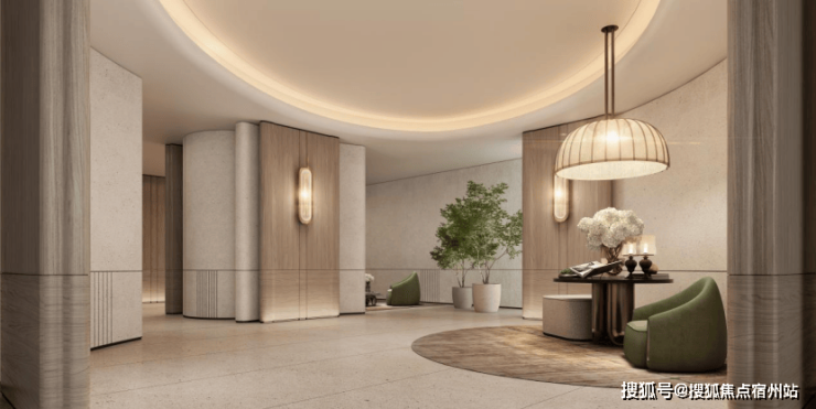 墙面地面石材通铺,圆弧形纹理的吊顶再次呼应整体曲线设计语言,搭配暖色灯光和大面积落地窗,电梯时间同样满眼绿色。