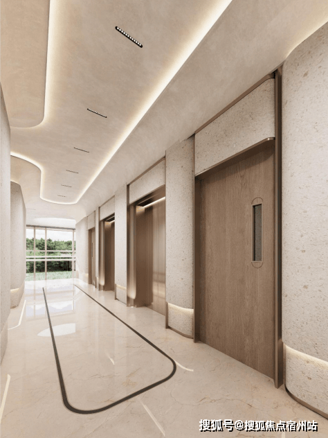 标准层电梯厅 中,主厅地面均为石材,3D弧形墙面,吊顶曲线与地面呼应,以品质细节,进一步深化仪式感。