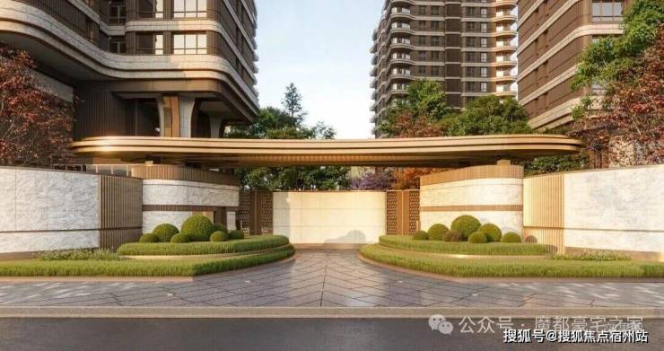 回看住宅楼栋, 流动的立面 与波光粼粼相互呼应,曲线模仿“飘带”线条,进口浅色花岗岩,结合金属铝板包边,形成“金镶玉"的高级质感。