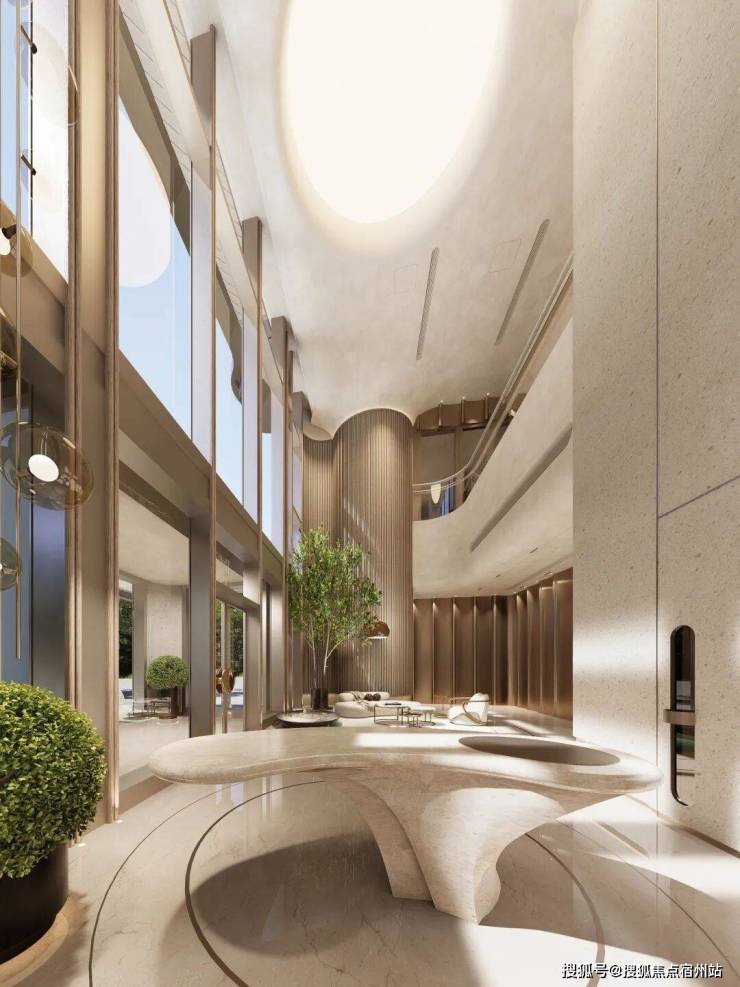 进入 一层单元入户大堂 ,双层挑空约9米。室内的设计风格同样延续了外立面流动波浪的理念,以曲线营造空间质感。