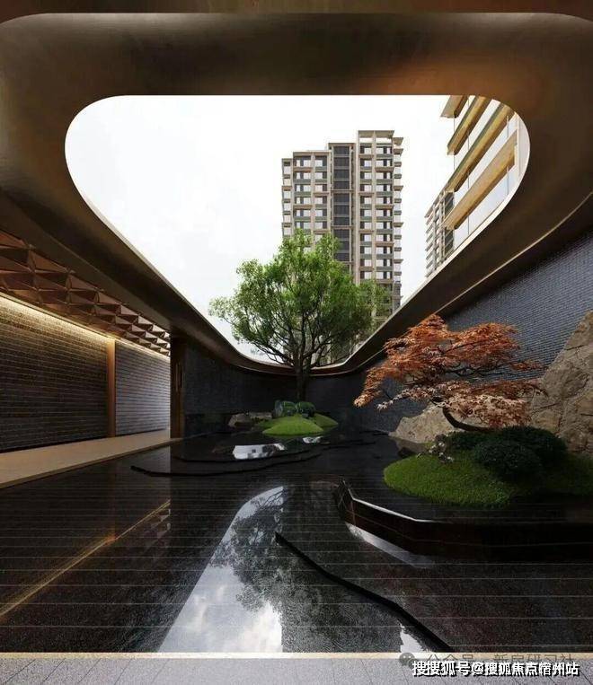 山水长卷的隐奢门庭:取意豫园中式园韵,打造约 99 米隐奢入口空间结合独立的车马院,风雨廊道与人车分流独立双入口,带来尊贵的归家体验。