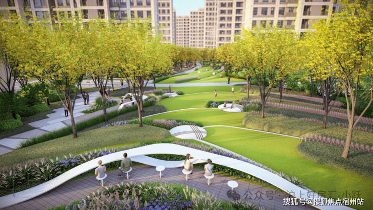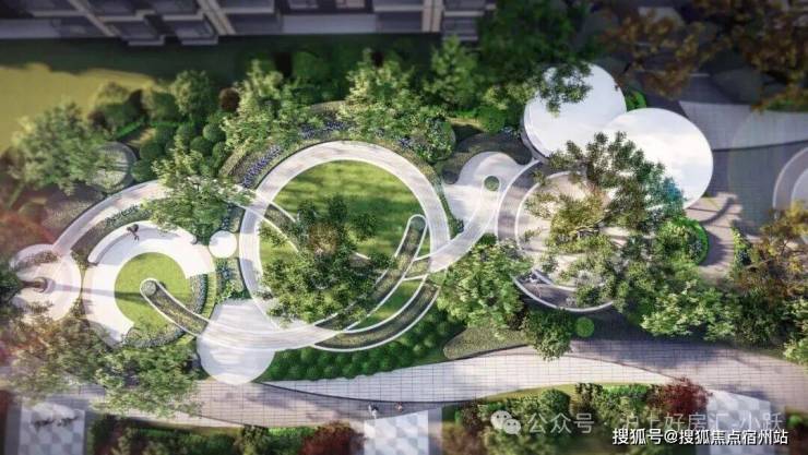 以 公园+花园的双园社区、品质归家入口、特色阳光草坪、双会客系统、主题儿童乐园、健身系统这六大功能价值为主,并且融合由三条不同主题的林荫步道和三个圆形景观节点组成的 “绿林项链”全区漫步系统,共同构成全区“6+1”森O₂家园系统。