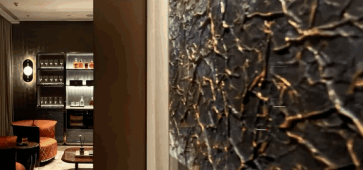走道端处香槟色金属雕塑,形类城市高楼,又若恋人彼此依偎;全采光套房拥揽白日上海黄浦的忙碌、繁华,也收藏夜晚灯火阑珊的宁静、美好。