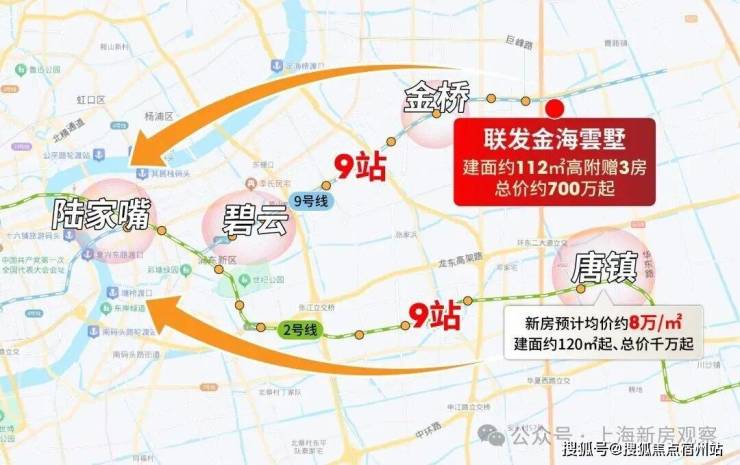 张江辐射的唐镇、前滩辐射但无地铁的三林而言,金桥东的交通能级就太强劲了; 通过9号线,2站金桥核心、9站陆家嘴。 要知道8万+唐镇到陆家嘴同样是9站,但房价差了近200万+!