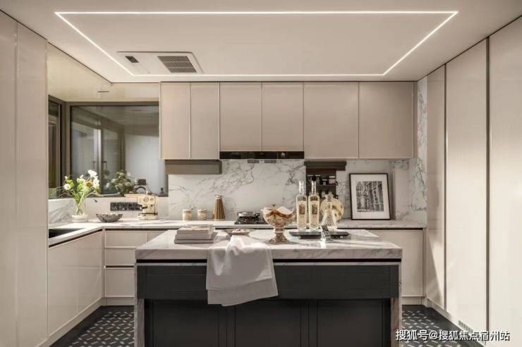 厨房更是拥有别墅级大空间,通铺中央空调、地段,甚至还有交付的奢石大岛台。