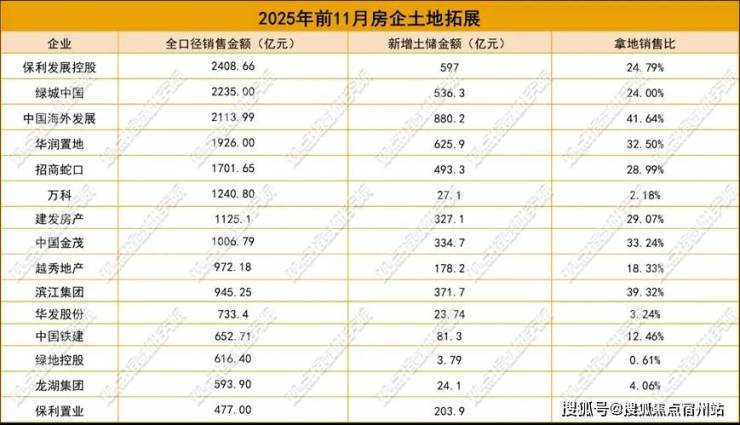 从拿地销售比来看,2025年1-11月房企拿地销售比同比回升明显,其中全口径销售前三的保利发展控股、绿城中国、中海地产,今年前11月拿地销售比和上年相比分别回升5.90、6.30和25个百分点。