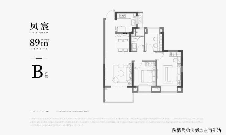 约89㎡三房采用三开间朝南的布局,保证了充足采光,非常适合新婚家庭或首次置业的年轻群体。