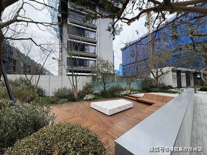通道两边都做了如下这样的休闲卡座、绿化带、小组团景观,极力弱化了小区的边界感;两边地块的入户门头连同地面铺装也都是做好的。