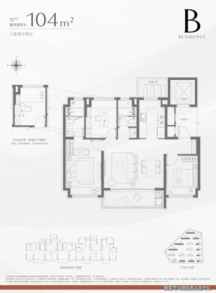 建面约104㎡3房2卫: