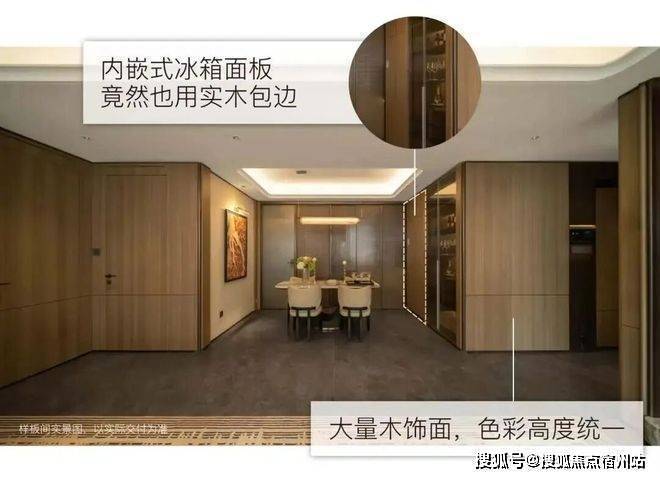 项目墙面铺设大量木饰面,相比墙布,更具质感更温馨。✅✅江湾金茂府售楼处电话:400 - 882 - 4258✅✅同时为了保持室内色调的统一,建面126㎡内嵌式冰箱的面板也采用木饰面。