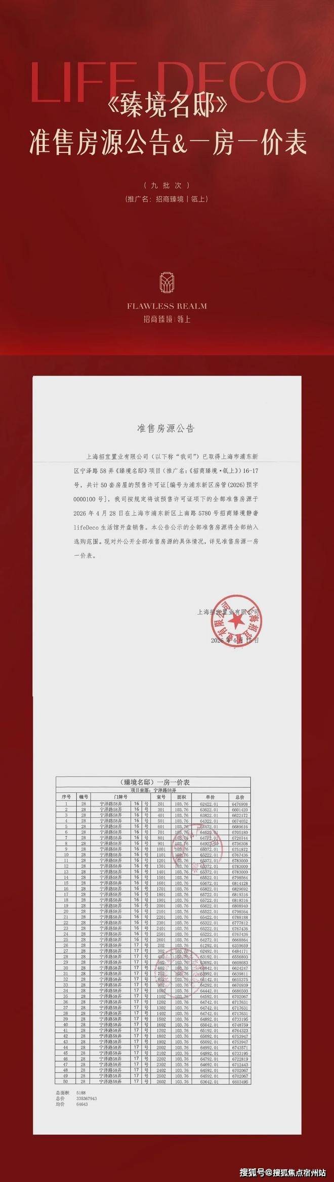 为增强信息的权威性与透明度,我们同步公示招商臻境项目经上海市浦东新区房地产主管部门备案核准的全套核心信息,所有内容均真实可查、权威有效,以此示范官方信息的规范性与严肃性: