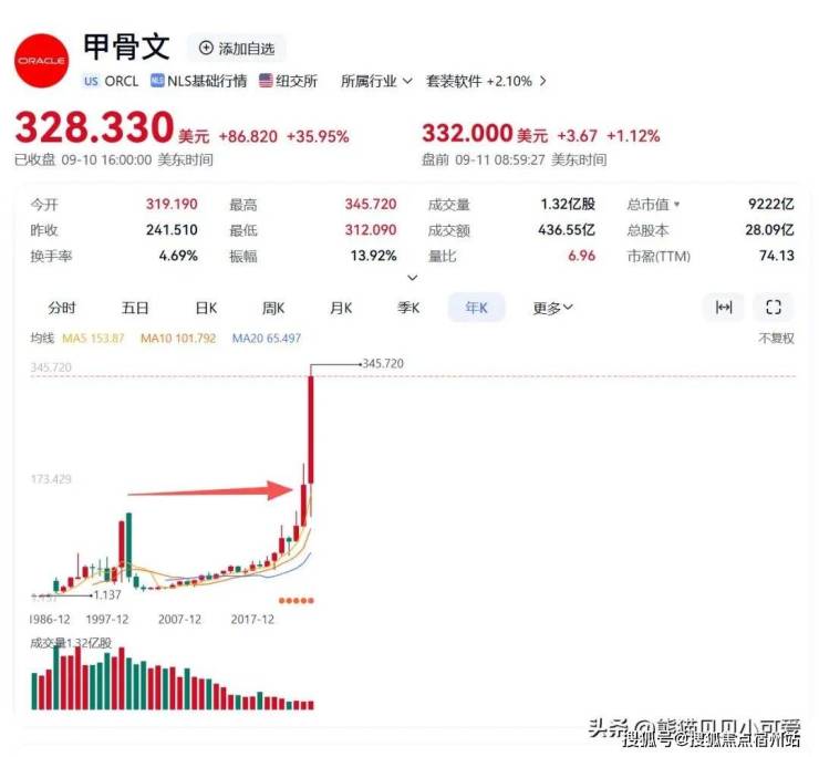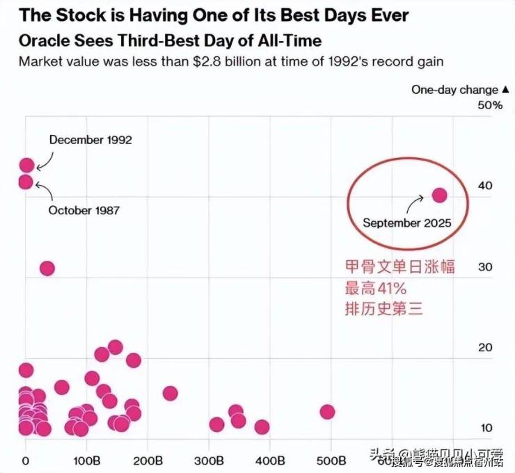 这个事情的背后,其实更有看头: 就在9月10日交易时间内,甲骨文股价飙升36%,创下自1992 年以来的最大单日百分比涨幅,单日市值暴增2440亿美元。