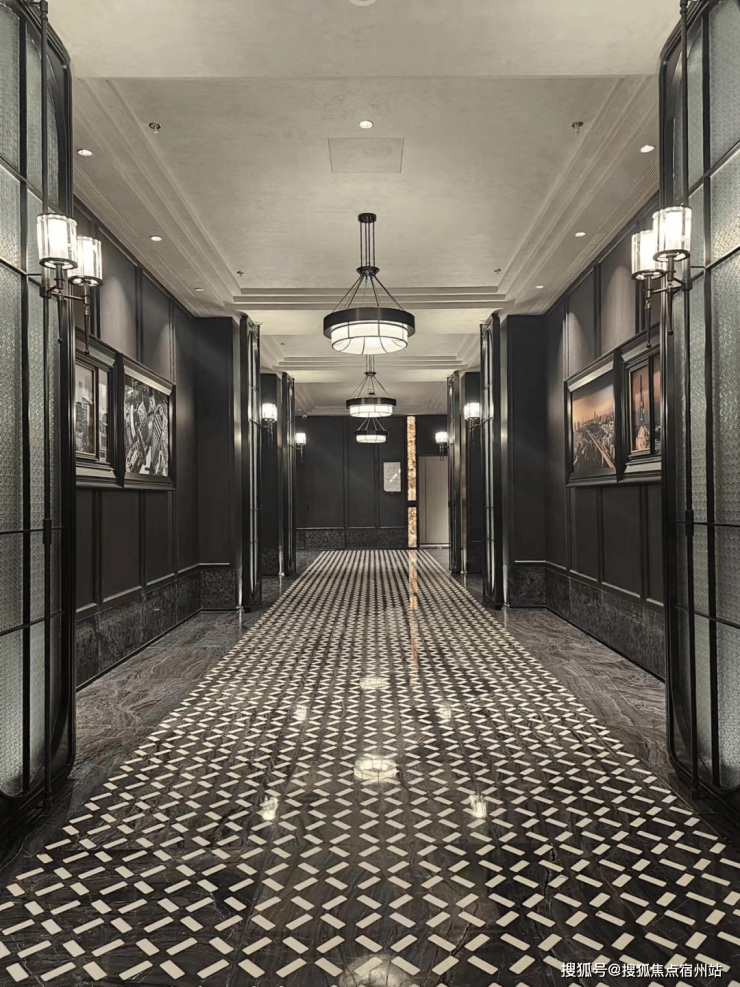 同时,酒店式入户大堂溯源海派经典,融入 古铜色金属格栅、海派拼花(首层和地下大堂)、海派复古压花玻璃等海派表达,让人文感满满。