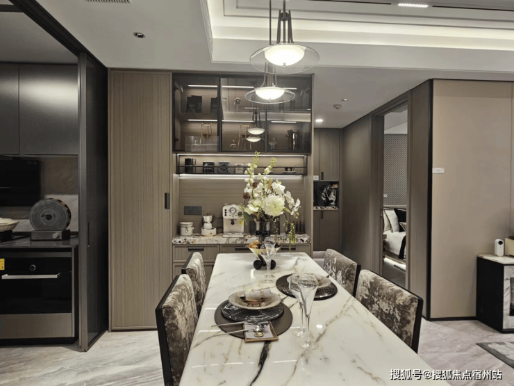 餐厅区域放置一个餐边柜,同样选用了雪山飞狐奢石做透光台面设计,餐边柜在收纳储物方面具有显著作用。