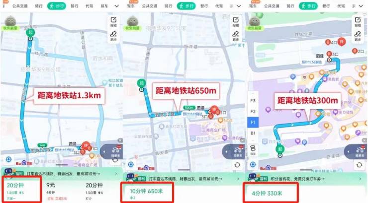 客户终究会用脚丈量之后才会买单,是不是地铁房要看步行能不能进站。 而直线距离300米,是步行进站的准线。