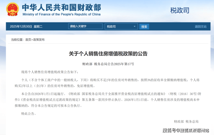 12月30日,财政部、税务总局发布《关于个人销售住房增值税政策的公告》,个人(不含个体工商户中的一般纳税人)购房不足2年的住房对外销售的,增值税率由原来的5.3%降至3%。购房2年以上的住房对外销售的,免征增值税。