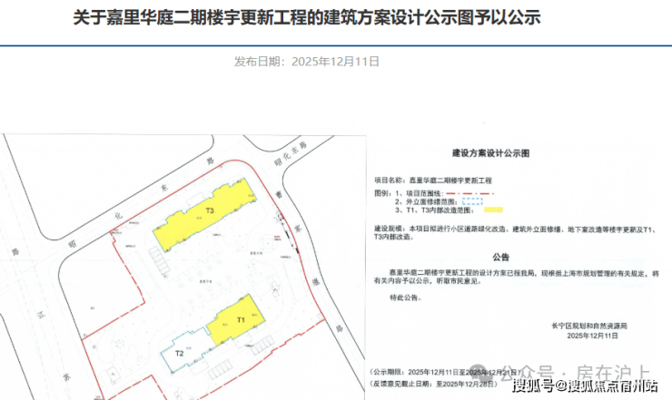 根据长宁规资局最新信息显示,本项目拟进行小区道路绿化改造、建筑外立面修缮、地下室改造等楼宇更新及T1、T3内部改造。