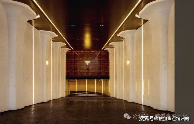 门庭延街的外立面,以精工定制弧形米色石材为主调,✅✅海上清和玺售楼处电话:400 - 8824 - 258✅✅镶嵌典藏级老虎玉大理石,点缀古铜色现代海派艺术感灯器,整体呈现出百年海派的贵雅气质。